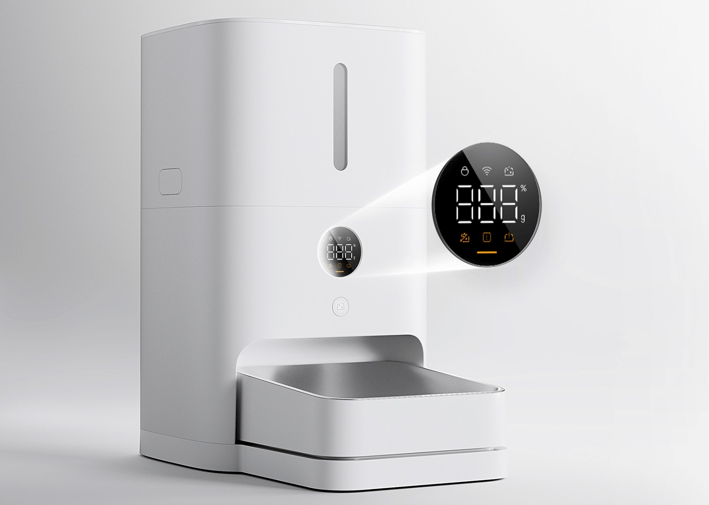 LED-экран с высоким разрешением отображает вес корма в реальном времени. Статус устройства виден с одного взгляда, что делает использование кормушки интуитивно понятным. Такой дизайн добавляет удобства и уверенности в том, что питомец всегда обеспечен всем необходимым.