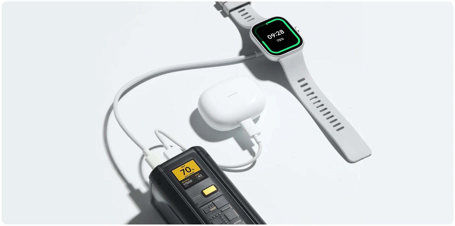 Этот пауэрбанк оснащен тремя портами, каждый из которых предназначен для разных устройств. Первый USB Type-C поддерживает мощность до 140 Вт и протокол Power Delivery 3.1, что позволяет быстро заряжать даже ноутбуки, такие как MacBook Pro. Второй USB Type-C обеспечивает мощность до 45 Вт для более компактных устройств, а порт USB Type-A выдаёт до 120 Вт, что делает пауэрбанк универсальным решением для зарядки целого спектра девайсов.